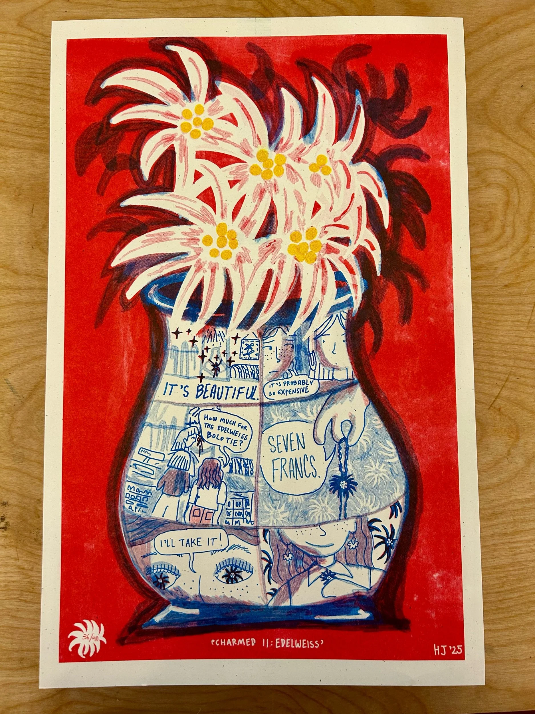 Shop › Edelweiss Print Image 1 of 1 Edelweiss Print $20.00 Charmed II: Edelweiss11x17 risograph print featuring bright red, yellow, or blue Quantity: Purchase Added! Charmed II: Edelweiss11x17 risograph print featuring bright red, yellow, or blue